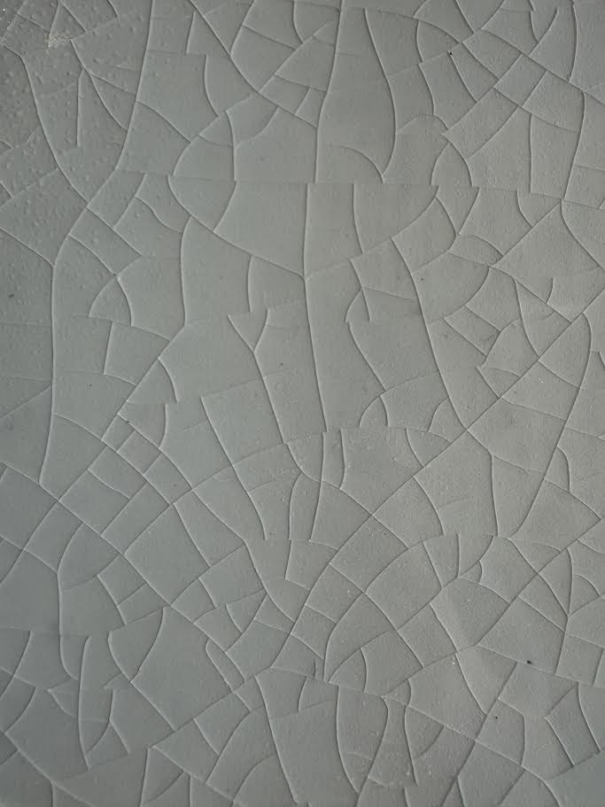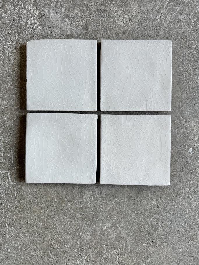A terracotta square tile with a glossy white glaze & crackle finish.