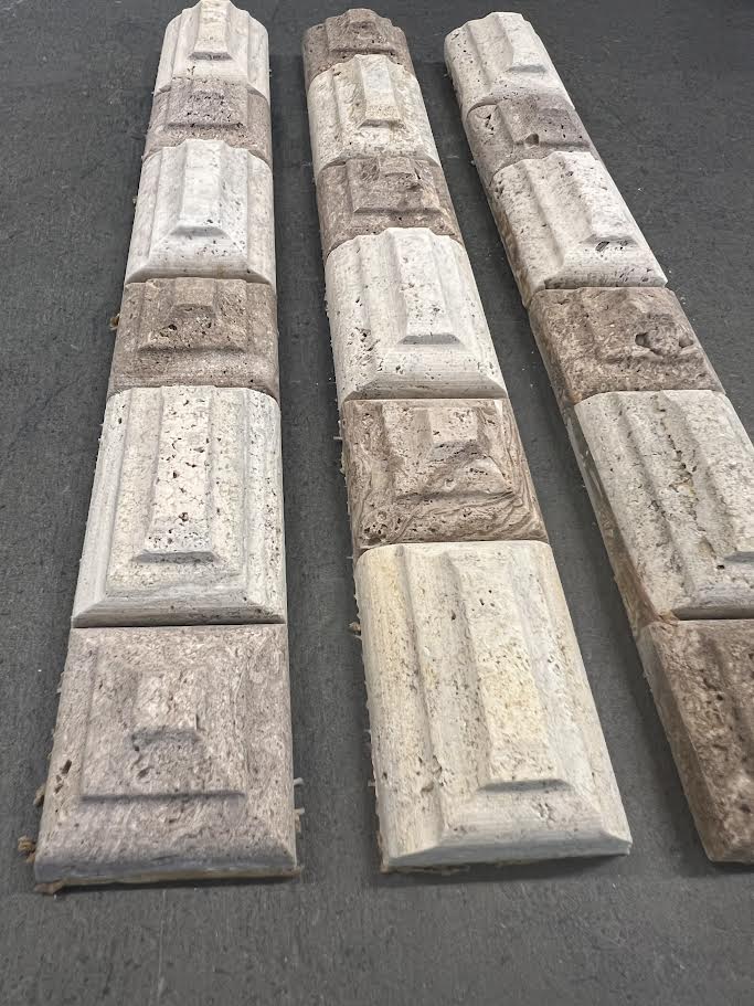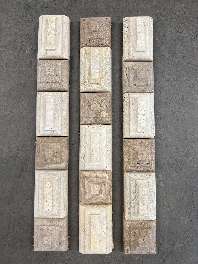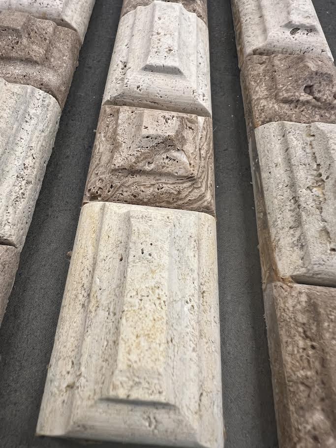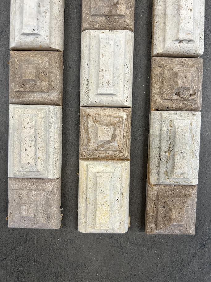 A decorative border tile made with light and dark travertine, crafted with a raised geometric pattern.
