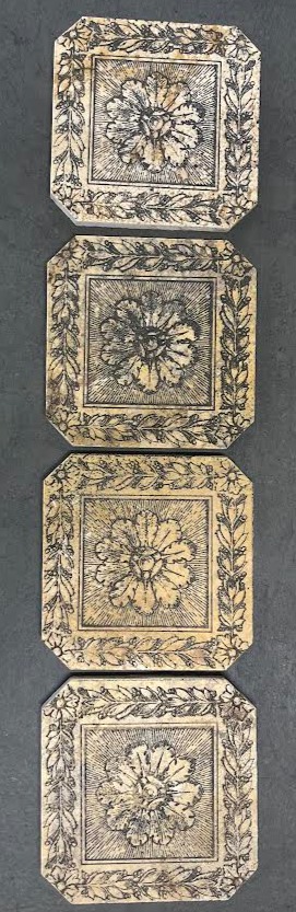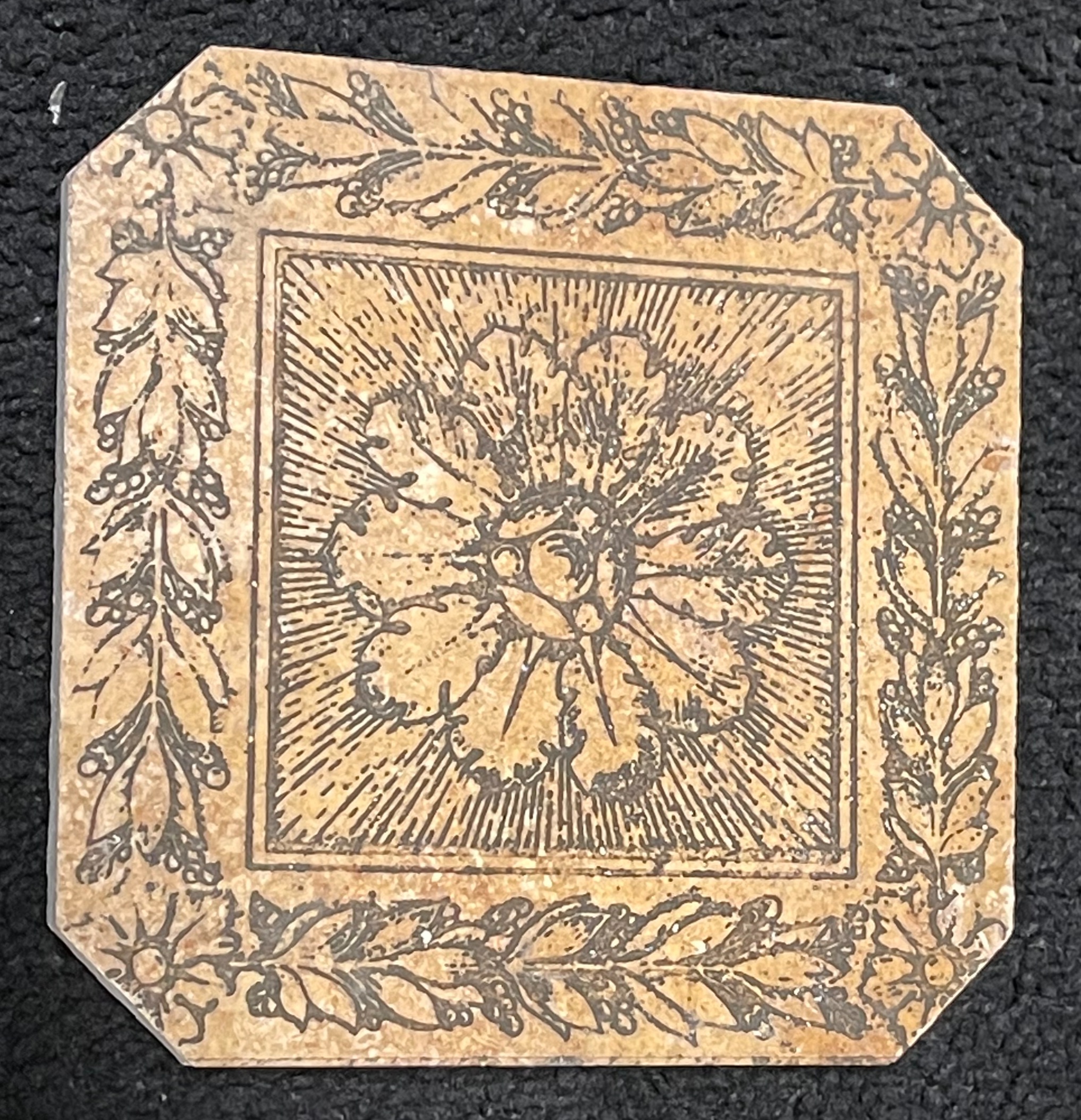 An Argentinian travertine tile with clipped corners featuring a central floral design surrounded by a detailed botanical border.